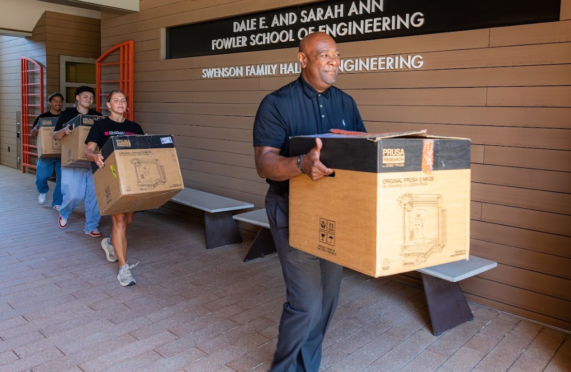 Staff and students from Chapman’s Fowler School of Engineering loaded the printers at the Keck Center for Science and Engineering and delivered them to the OUSD warehouse.