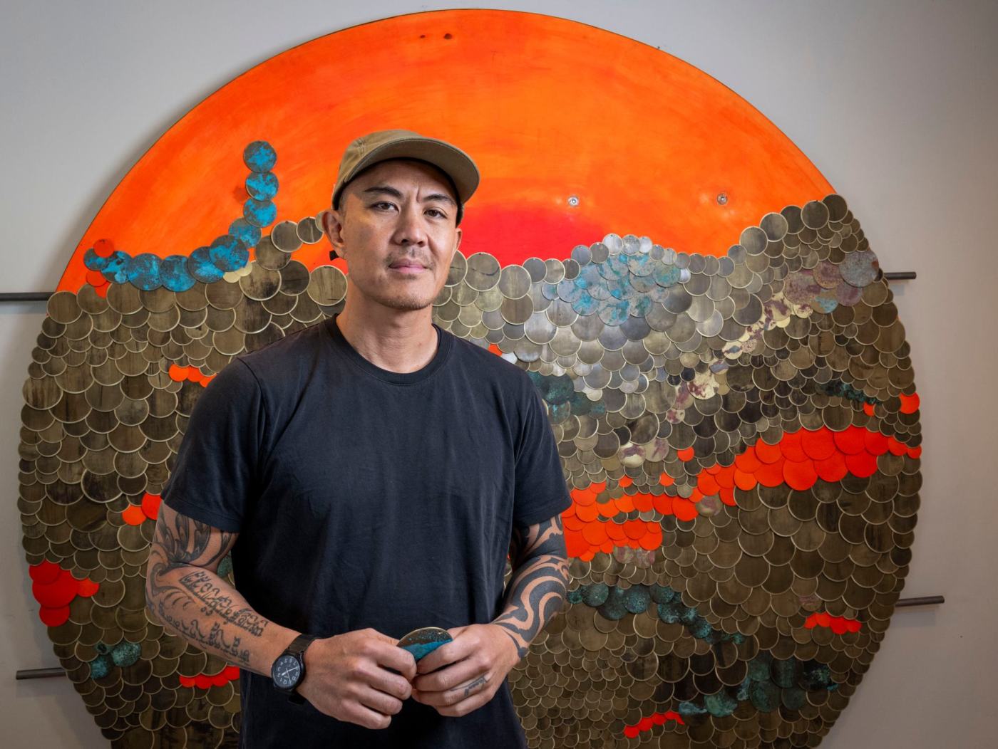 Some of Nguyen’s works include “The Specter of Ancestors Becoming,” “The Unburied Sounds of a Troubled Horizon” (2022) and recently, “Strike” (2025), a spherical sculpture made from pounded brass of artillery shells, which he worked in the garage of his mother’s Irvine home.
